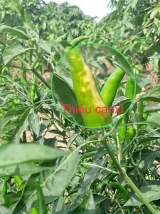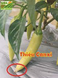 Triệu chứng thiếu canxi trên cây ớt như: lá non nhỏ nhăn không bóng, phần trái gần cuống màu đỏ sậm cứng không chuyển màu, các phần còn lại của trái hoặc trên trái xanh có vệt vàng chạy dọc theo chiều dài trái, nhưng biểu hiện thiếu canxi thường thấy nhất là hiện tượng thối đuôi trái.